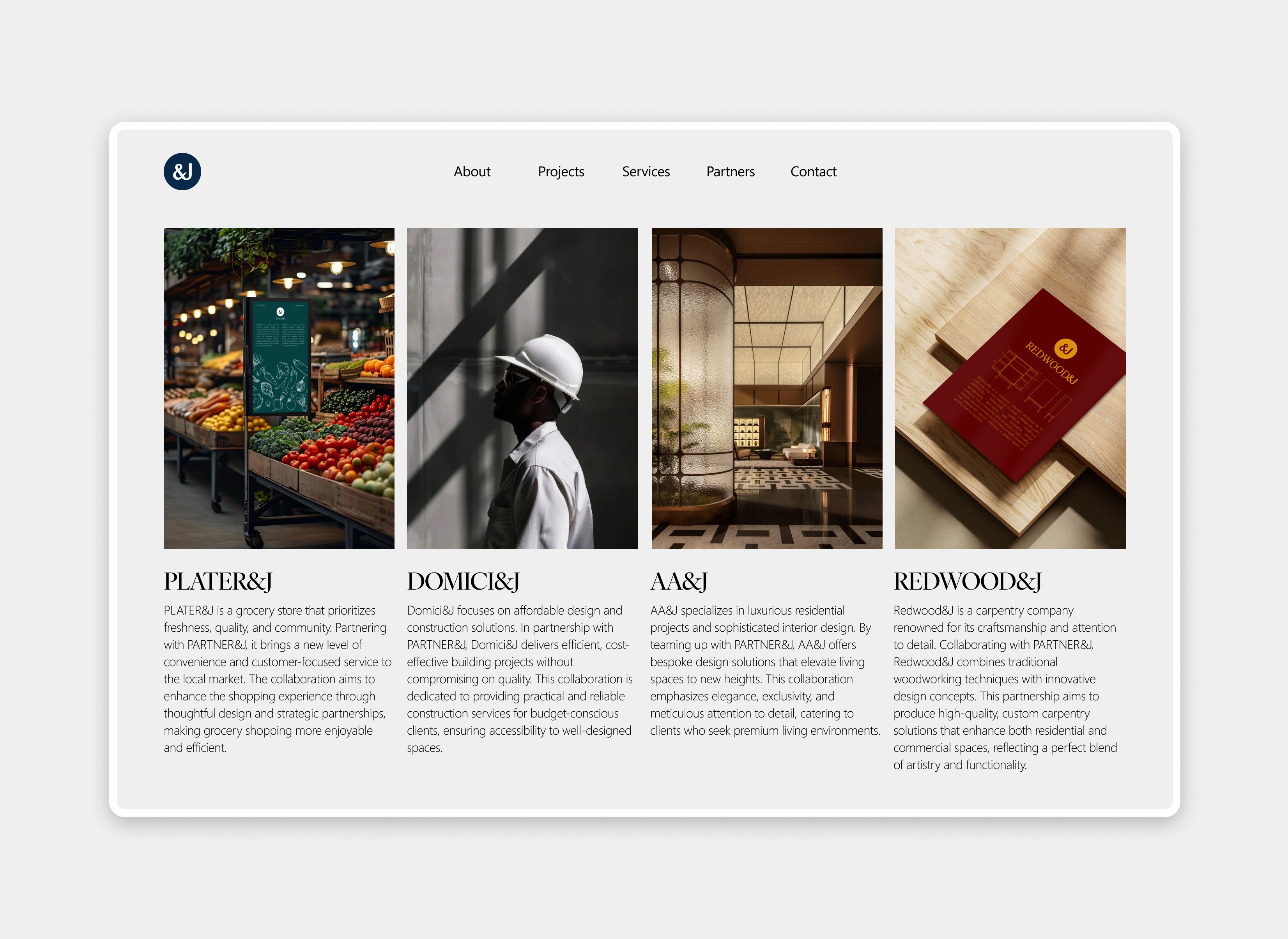 Subsidiary Branding: Each new venture adopts the &J suffix, highlighting its collaborative origin. Examples include DOMICI&J and CONSTRUCTION&J, showcasing the brand’s expansive partnership approach.
